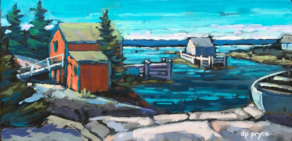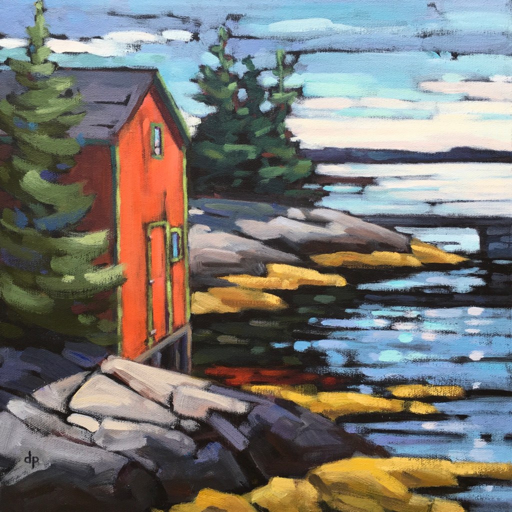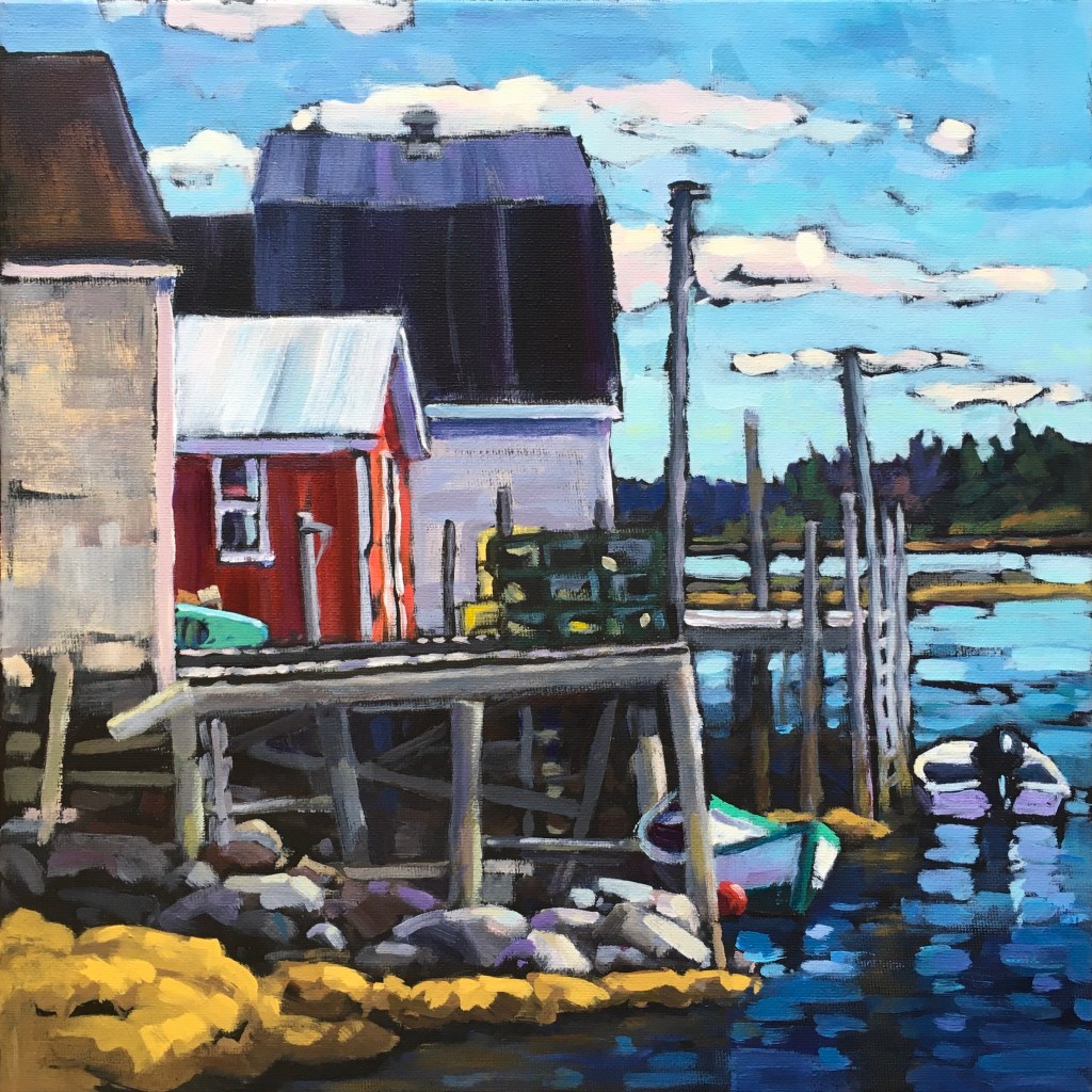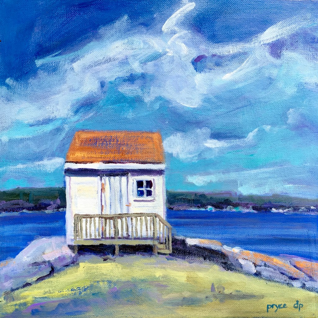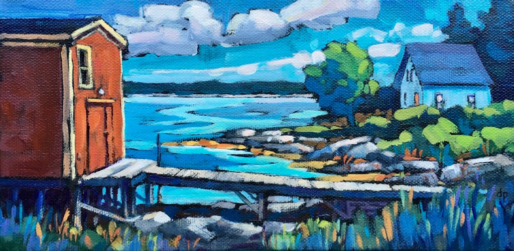 We have been living on the South Shore of Nova Scotia for just over a decade now. It didn’t take long for the beauty of the sea side to sneak its way into my paintings. I especially enjoy including a fishing outbuilding or two in the view!