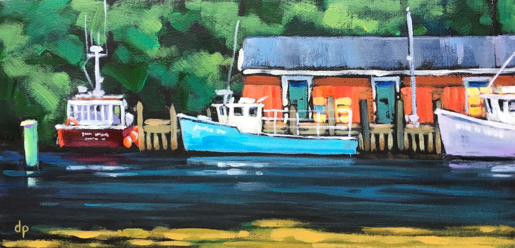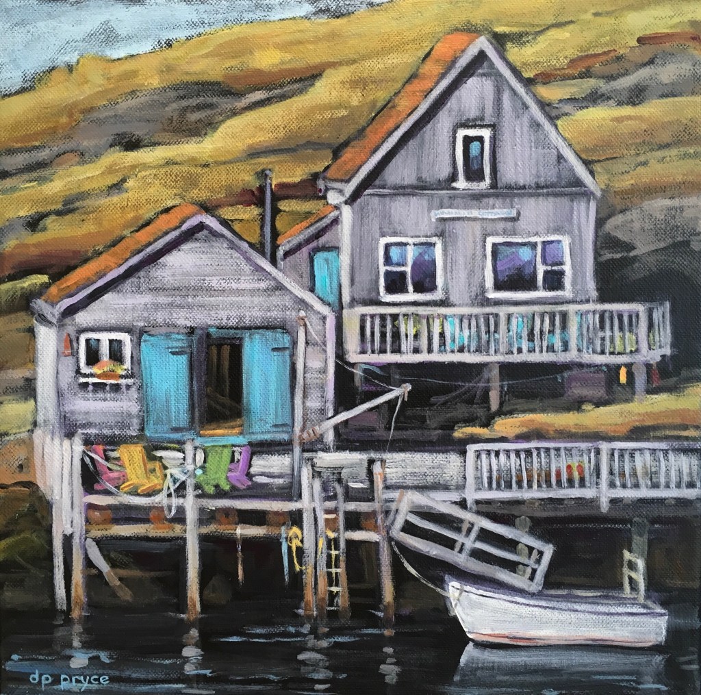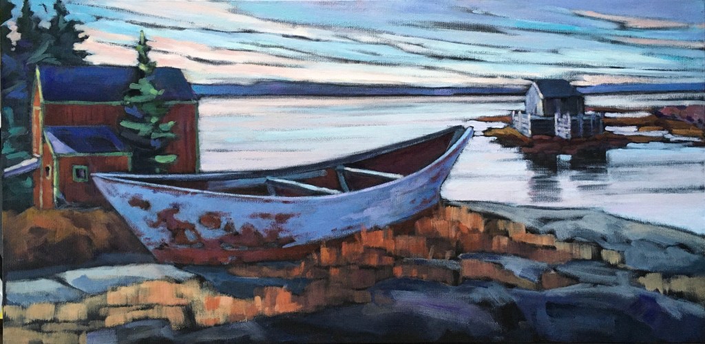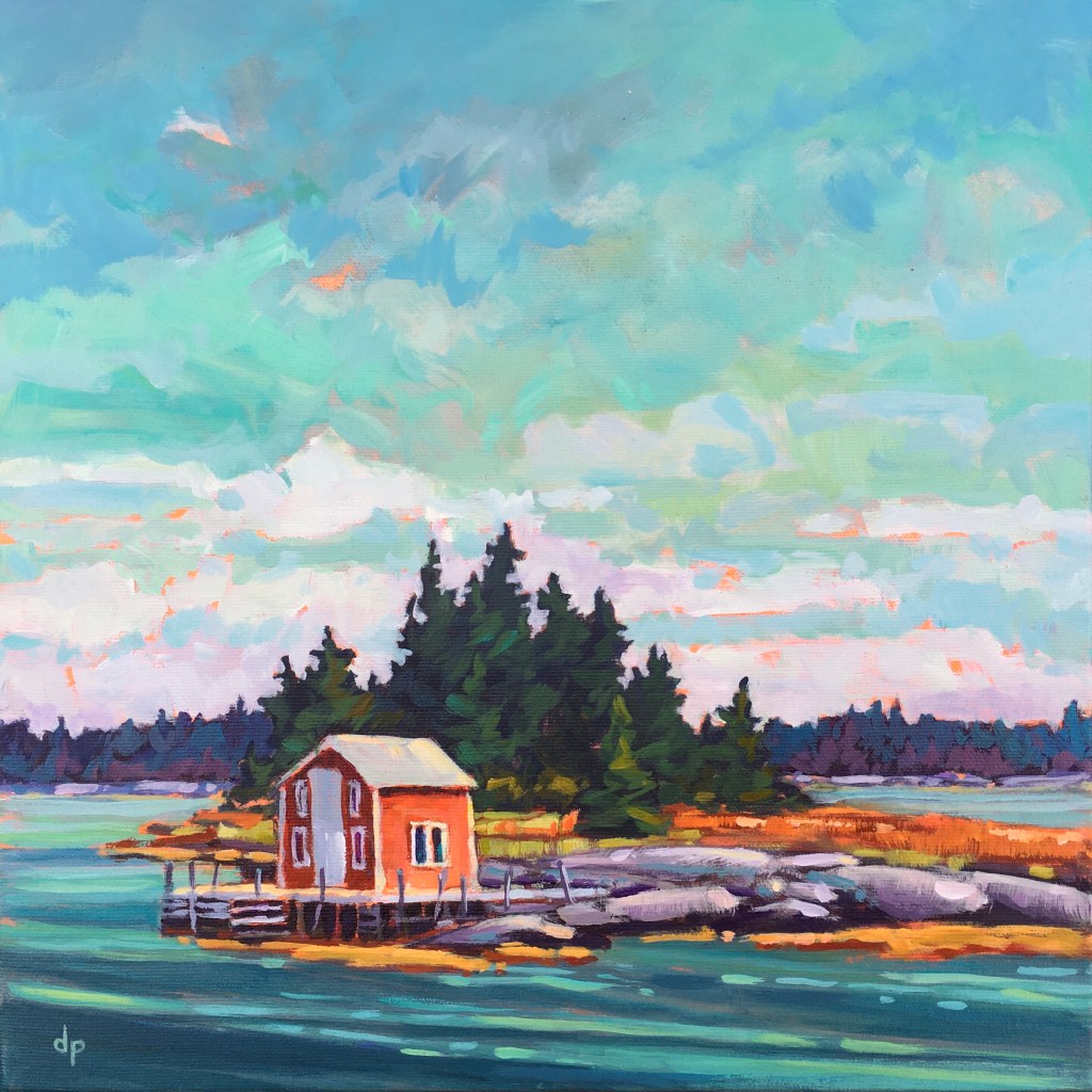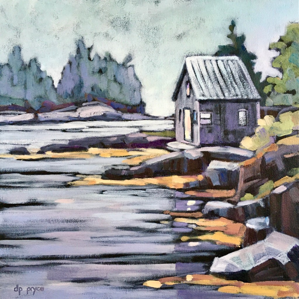We have been living on the South Shore of Nova Scotia for just over a decade now. It didn’t take long for the beauty of the sea side to sneak its way into my paintings. I especially enjoy including a fishing outbuilding or two in the view!